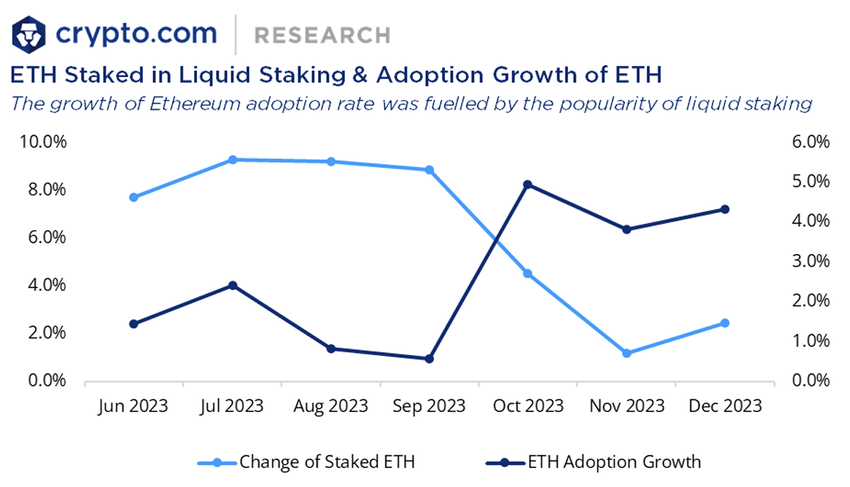 La crescita delle adozioni di ETH è stata quasi parallela alle variazioni degli interessi di ETH. In effetti, l’interesse per la liquidità è ancora in tendenza dopo l’aggiornamento di Shanghai. Sia il BTC che l’ETH hanno registrato un aumento significativo delle adozioni nel quarto trimestre del 2023, stimolato dagli sviluppi degli ETF su Bitcoin ed Ether.