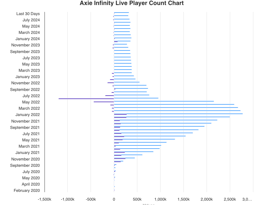Axie Infinity, un tempo modello di successo nei giochi blockchain, vantava 2,8 milioni di giocatori medi mensili nel gennaio 2022. Tuttavia, il mese scorso, la sua base di giocatori è scesa a circa 325.928, riflettendo tendenze più ampie nel settore dei giochi blockchain.