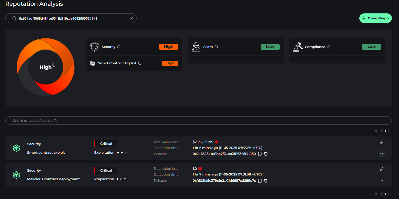 Secondo Cyvers, l’incidente è iniziato alle 07:31 UTC quando un wallet (0xB32A5) ha distribuito un contratto fraudolento. Solo due minuti dopo, un altro indirizzo (0x631adf) ha avviato una serie di transazioni sospette.