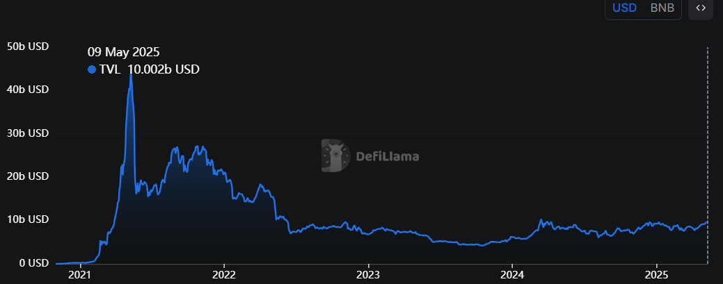 I dati di DefiLlama mostrano che il valore totale bloccato (TVL) su BNB Chain ha superato i 10 miliardi di dollari, raggiungendo un massimo di tre anni. Tuttavia, è ancora significativamente al di sotto del massimo storico del 2021 di oltre 40 miliardi di dollari.