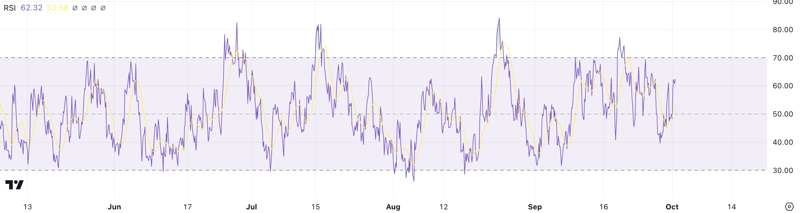 L’RSI di POPCAT è attualmente a 62,32, indicando che c’è ancora spazio per la crescita prima che l’asset entri nel territorio di sovracomprato, il che suggerisce ulteriori potenziali rialzi nel movimento dei prezzi.