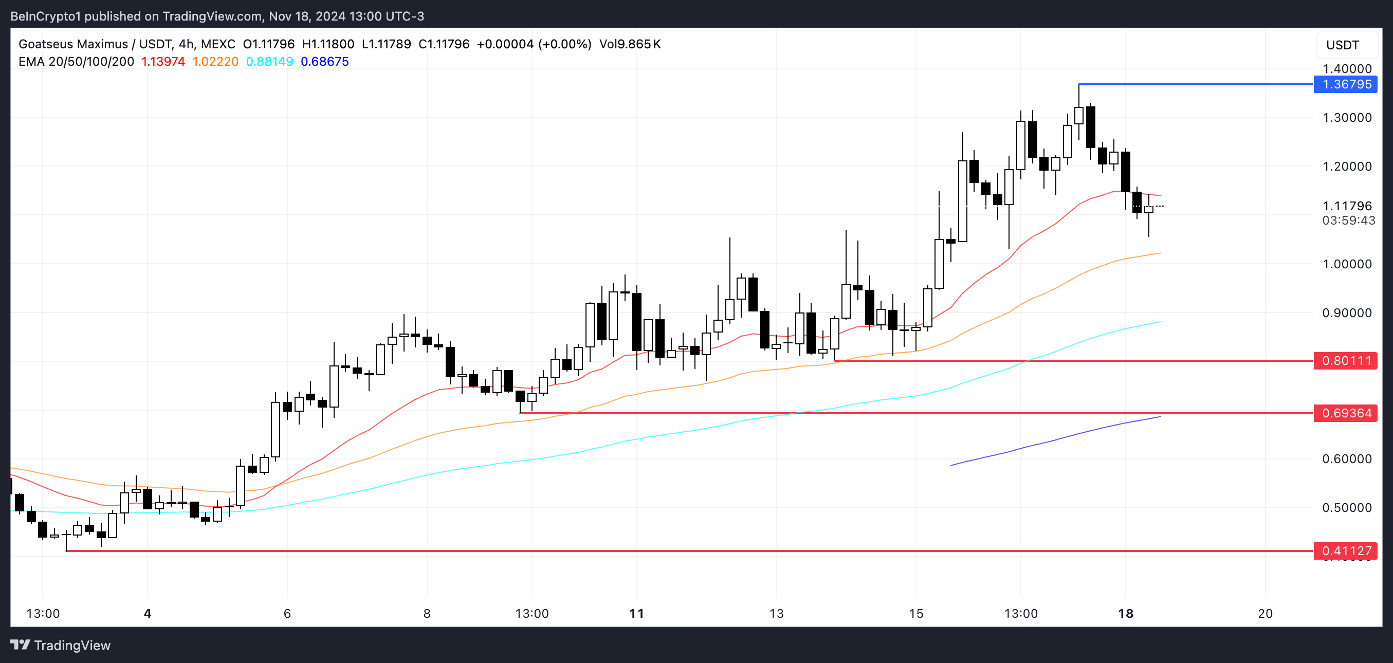 Se il trend ascendente riacquista momento, il prezzo di GOAT potrebbe mirare alla sua resistenza a 1,36 USD, segnalando potenziali ulteriori guadagni. Tuttavia, se la pressione discendente si intensifica, i livelli di supporto potrebbero essere testati a 0,80 USD e 0,69 USD.