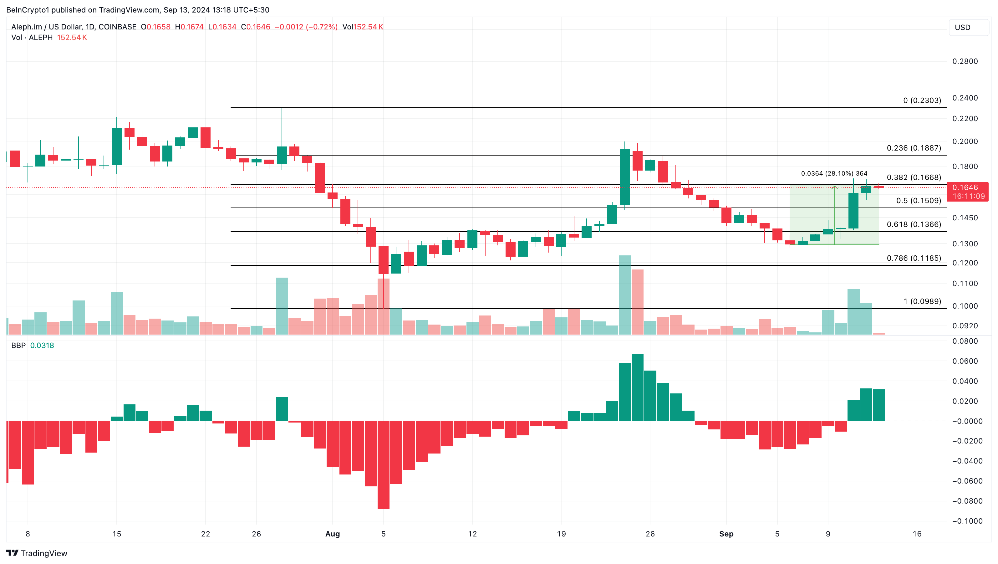 Se la tendenza continua, il prezzo di ALEPH potrebbe salire a 0,23 USD. Tuttavia, un calo della pressione d’acquisto potrebbe invertire questa prospettiva, portando potenzialmente a una caduta del prezzo a 0,13 USD.