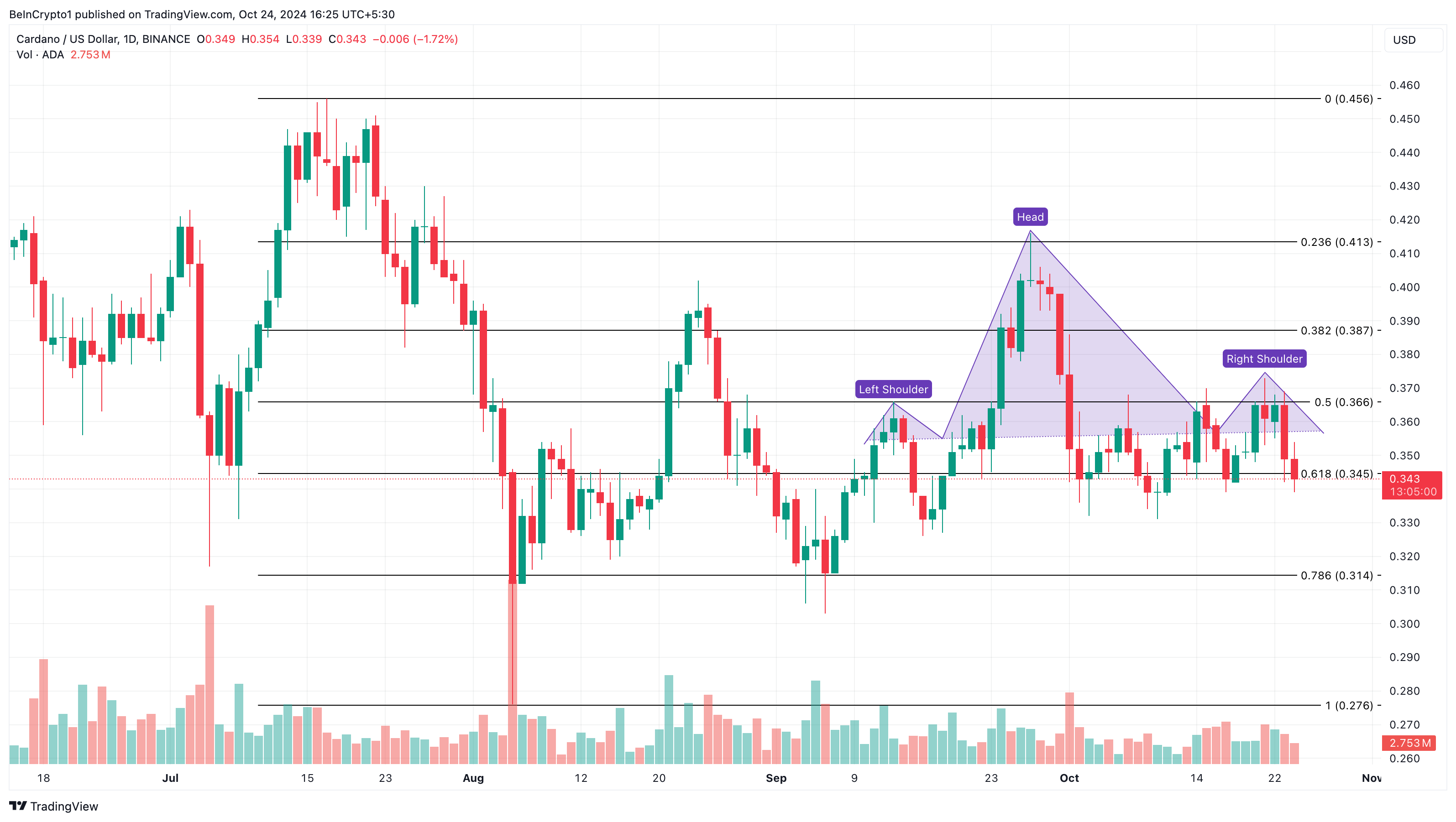 Al momento della scrittura, il prezzo di Cardano è USD 0,34. Secondo il grafico giornaliero, l’altcoin ha formato un pattern testa e spalle, che tecnicamente è da rialzo a ribasso. Pertanto, con questa posizione, è probabile che ADA scenda a USD 0,31.