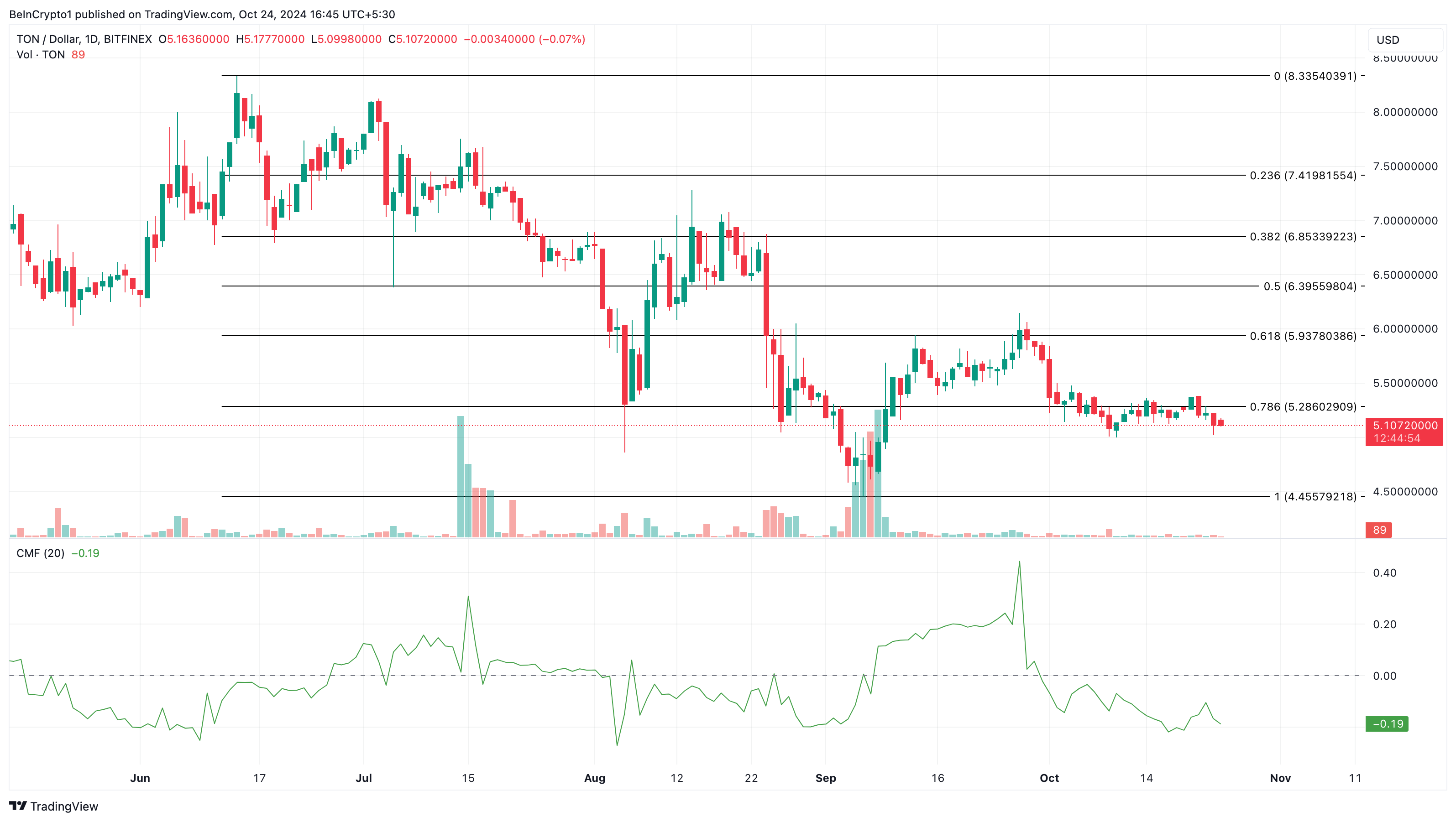 SponsoredTuttavia, l’hype intorno a TON ha faticato a tradursi in guadagni significativi per il prezzo di recente. Sul grafico giornaliero, il Chaikin Money Flow (CMF) è sotto la linea dello zero.