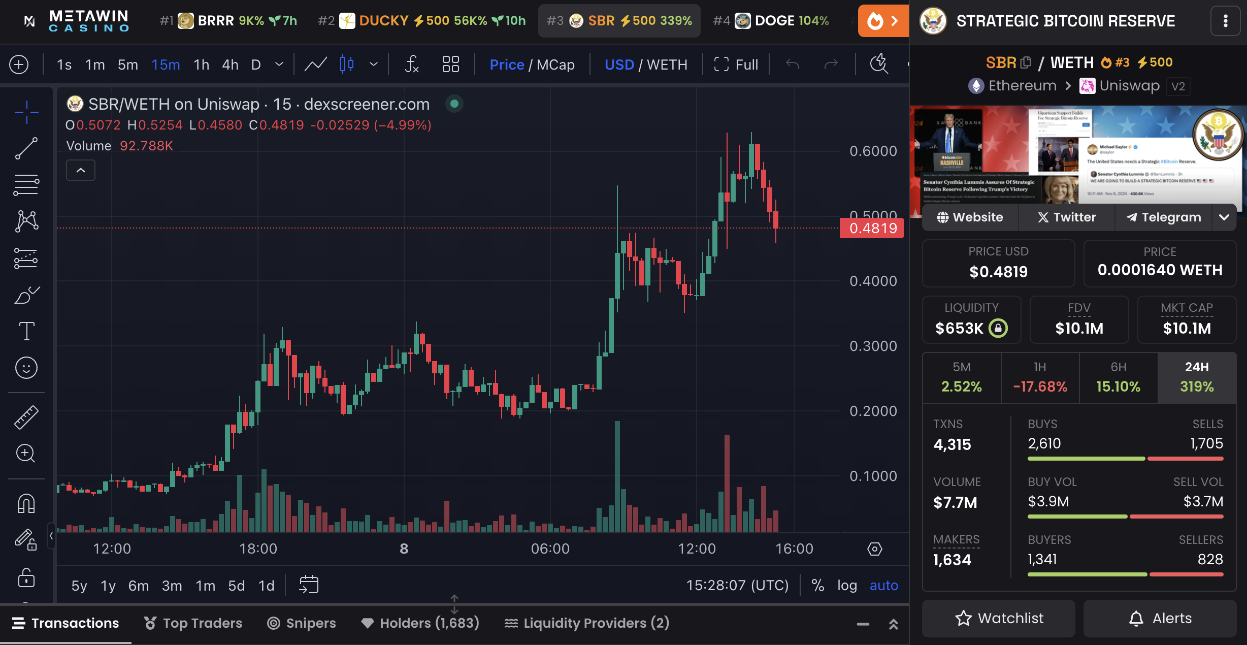 La Strategic Bitcoin Reserve (SBR), lanciata solo un giorno dopo l’elezione di Donald Trump a presidente degli Stati Uniti, sta rapidamente guadagnando terreno. Ospitata sulla blockchain di Ethereum e scambiabile su Uniswap, SBR ha già raccolto un’impressionante seguito, con quasi 1.700 detentori e un volume di transazioni di circa 4.300 al giorno.