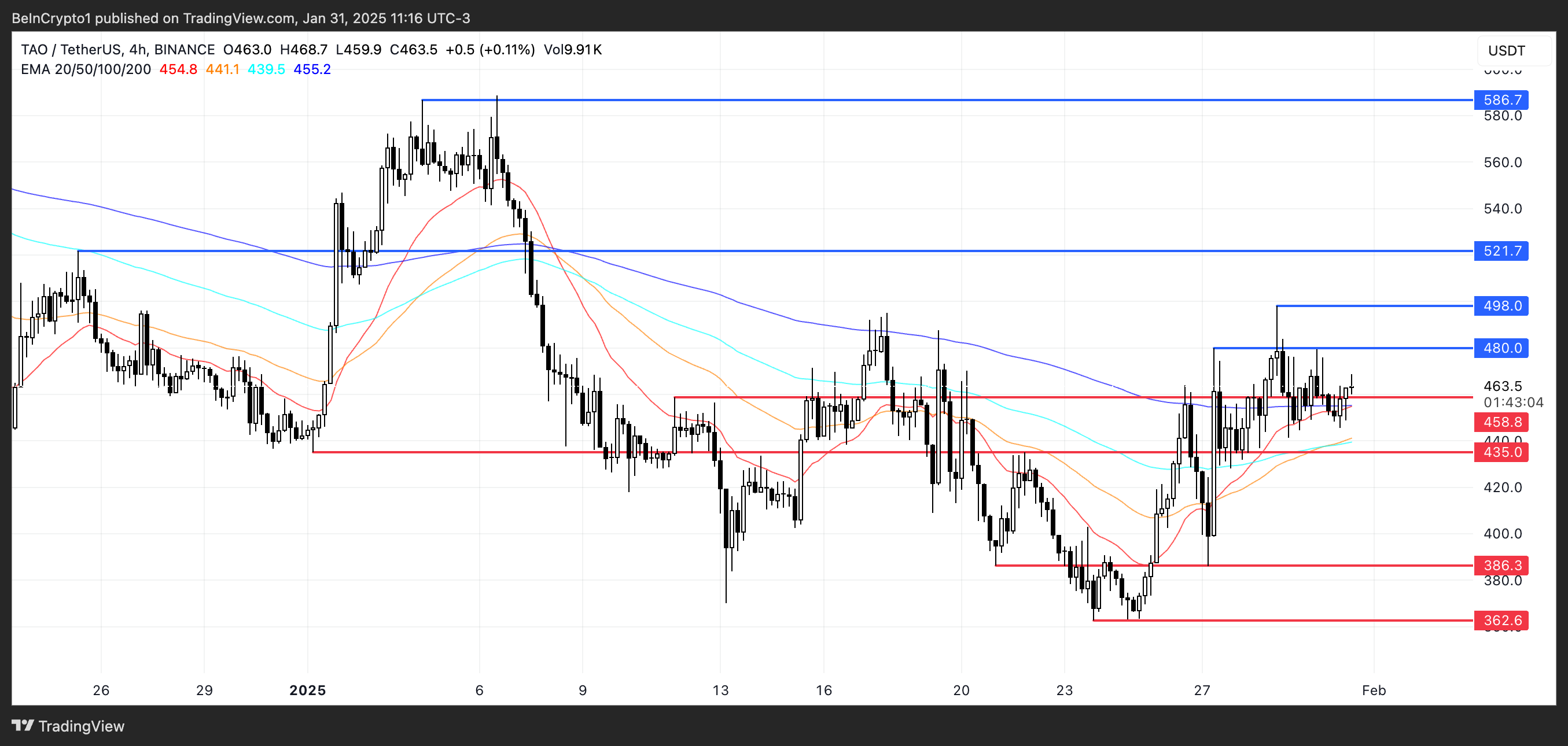 Le linee EMA indicano che TAO potrebbe presto formare un golden cross, potenzialmente spingendo il suo prezzo verso resistenze a 480 USD e 498 USD. Se l’hype AI si rafforza, TAO potrebbe salire a 521 USD o addirittura 586 USD. Tuttavia, se la tendenza si inverte, i supporti chiave a 458 USD e 435 USD devono reggere, o TAO potrebbe tornare a 386 USD o 362 USD.