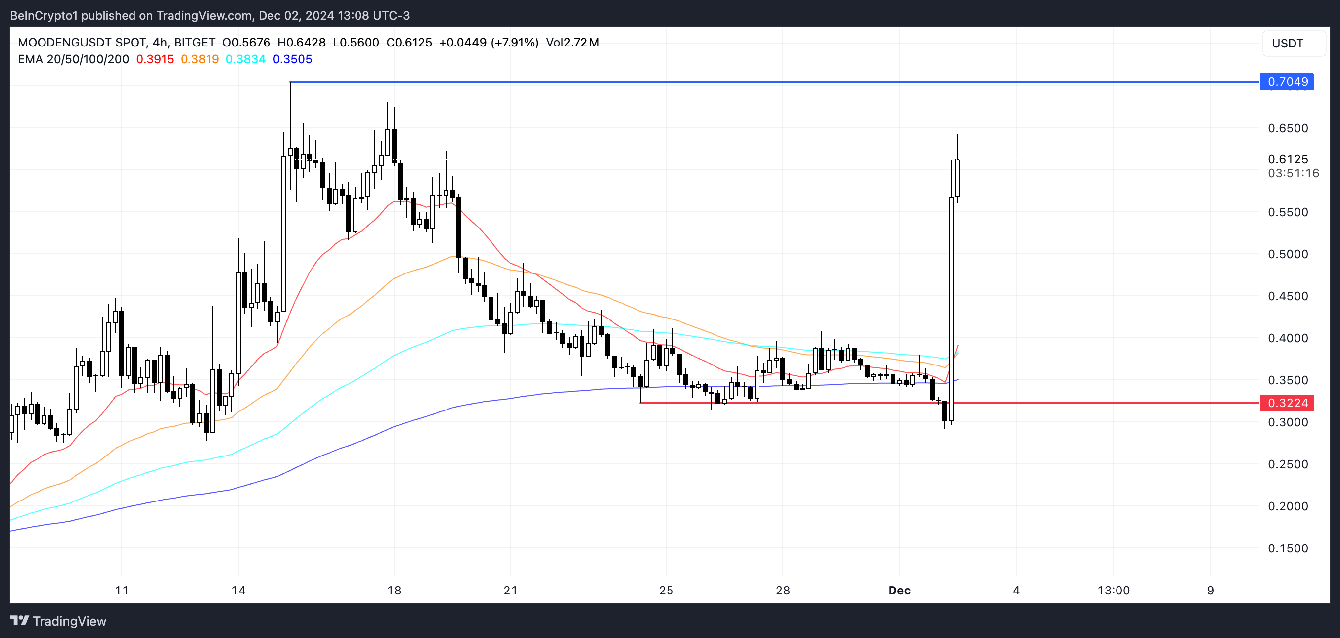 L’Indice di Forza Relativa (RSI) della moneta è aumentato drasticamente da 32 a quasi 80, suggerendo un rapido cambiamento del momentum di mercato. Gli investitori ora osservano attentamente se MOODENG può mantenere l’attuale trend rialzista e potenzialmente testare livelli di prezzo intorno a 0,7 USD.