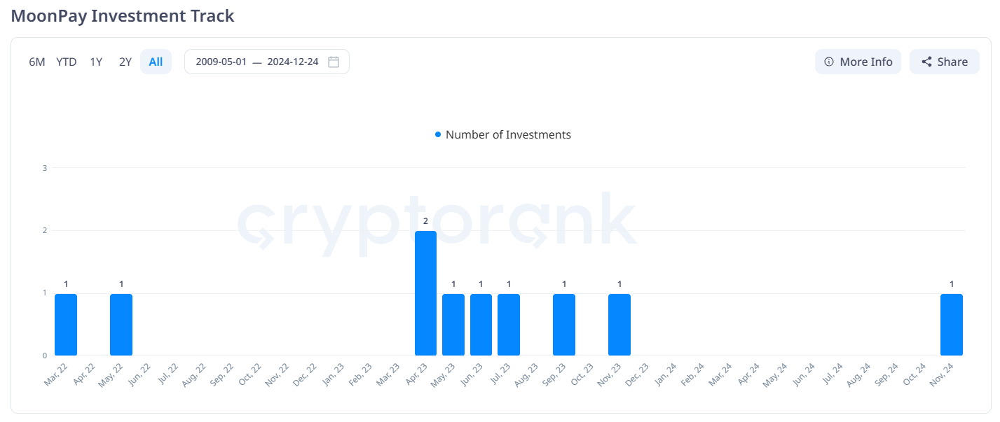I dati di Cryptorank mostrano che le attività di investimento di MoonPay sono state contenute nel 2024. Dal 2023, MoonPay ha investito in circa 10 progetti nel mercato crypto, con il 50% di questi legati agli NFT e al Metaverso. Tuttavia, questi due settori hanno avuto performance molto scarse nel 2024.