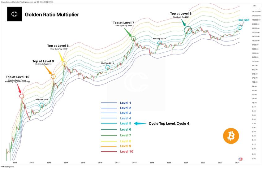 Un altro indicatore, il moltiplicatore del rapporto aureo, suggerisce che i top del Bitcoin si verificano tipicamente intorno al “livello 5”. Questa soglia si trova a 67.500 dollari nel ciclo attuale. È interessante notare che questo indicatore si è dimostrato accurato in tutti i cicli precedenti, con il Bitcoin che ha ripetutamente ritracciato dopo aver raggiunto questo livello.