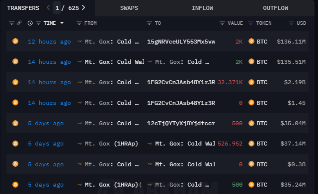 L’analisi di Arkham Intelligence ha rivelato che un importante indirizzo di portafoglio etichettato “1FG2C…Rveoy” ha spostato 30 371 BTC, mentre ulteriori 2 000 BTC sono inizialmente andati a un portafoglio freddo di Mt. Gox prima di essere trasferiti a un diverso indirizzo non marcato.