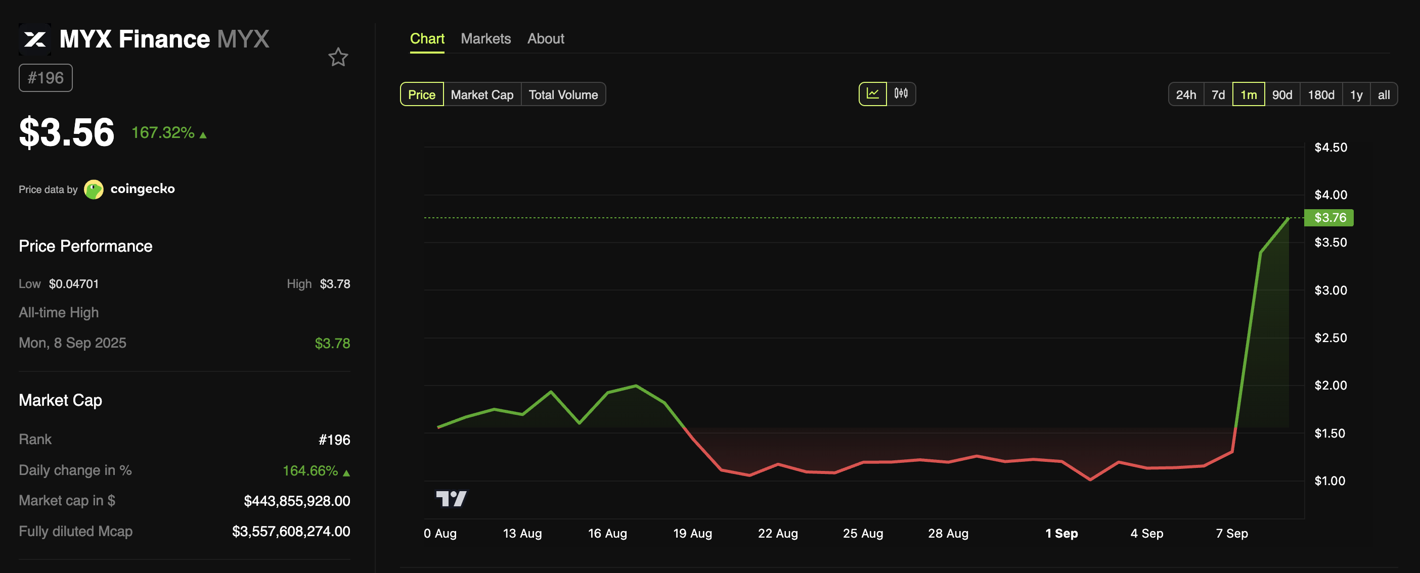 I dati di BeInCrypto Markets hanno mostrato che l’altcoin ha registrato un aumento del 167% nelle ultime 24 ore. Questa mattina, il prezzo ha raggiunto $3,78, rappresentando un nuovo record per MYX. Al momento della pubblicazione, era scambiato a $3,56.