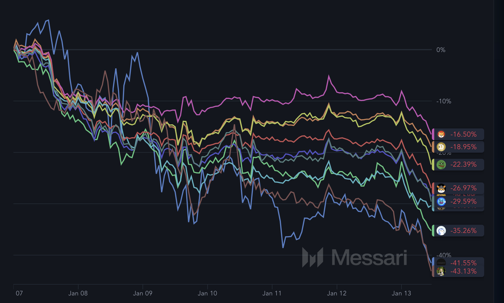 I meme coins occupano il secondo posto per interesse, subito dietro l’IA, e sono stati una delle narrative più riconosciute nel crypto per anni, ma il 2025 è iniziato male per loro. Tutti i primi 10 meme coins sono stati in rosso negli ultimi sette giorni, con SPX e FARTCOIN che hanno subito perdite superiori al 40%.