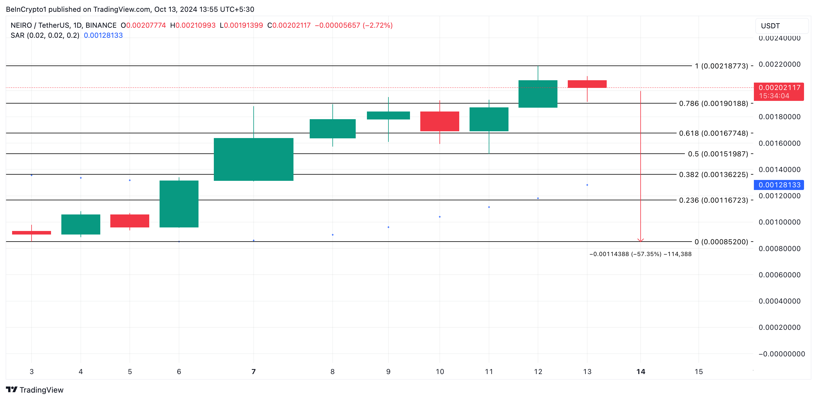 Notabilmente, le letture dello strumento di Ritrazione di Fibonacci di NEIRO indicano che, se la pressione di acquisto si indebolisce, il suo prezzo potrebbe scendere al livello di supporto principale a 0,00085 USD. Questo segnerebbe un calo del 57% rispetto al prezzo attuale di NEIRO di 0,0020 USD.