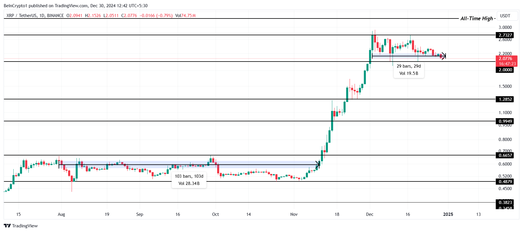 XRP si è consolidato nell’ultimo mese, rimanendo bloccato sotto il livello di resistenza di 2,73 USD mentre si mantiene sopra il supporto di 2,00 USD. Questo schema rispecchia un precedente periodo di consolidamento durato oltre tre mesi prima che XRP finalmente si riprendesse a novembre di quest’anno, aumentando la possibilità di una tempistica simile.