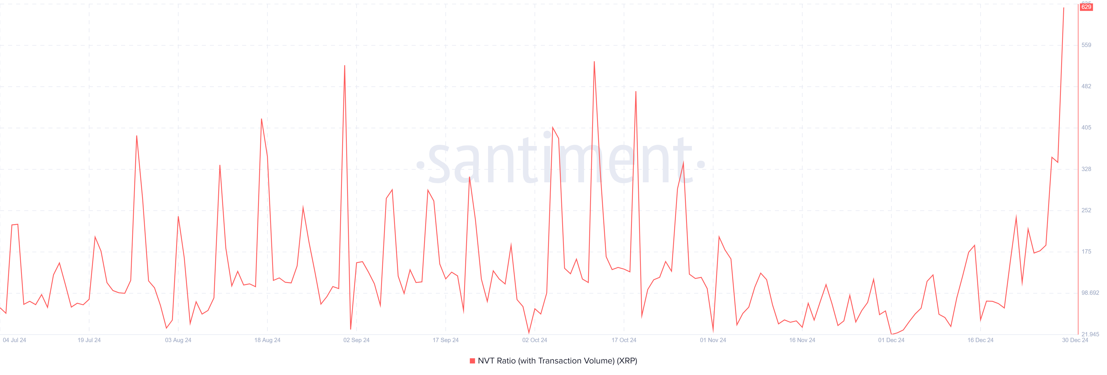 Il rapporto NVT (Network Value to Transaction) indica che il valore di rete di XRP supera attualmente il suo valore transazionale. Storicamente, questo squilibrio ha preceduto correzioni, poiché valutazioni di rete gonfiate sono spesso seguite da perdite per gli investitori.