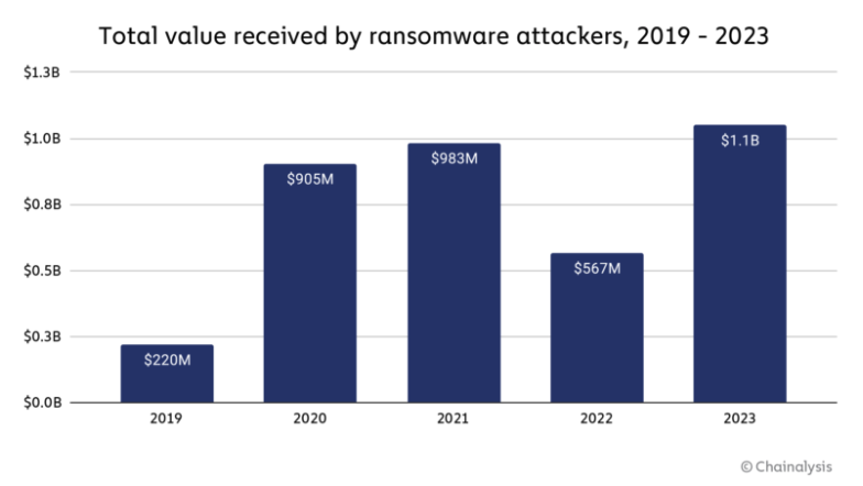 La società dianalisi sulblockchain Chainalysis ha sostenuto che gli attacchi ransomware sono aumentati nel 2023 fino a superare il miliardo di dollari dopo un calo nel 2022. La società di sicurezza informatica Recorded Future ha confermato circa 583 nuove varianti di ransomware. Queste varianti possono minacciare la sicurezza informatica e delle criptovalute.