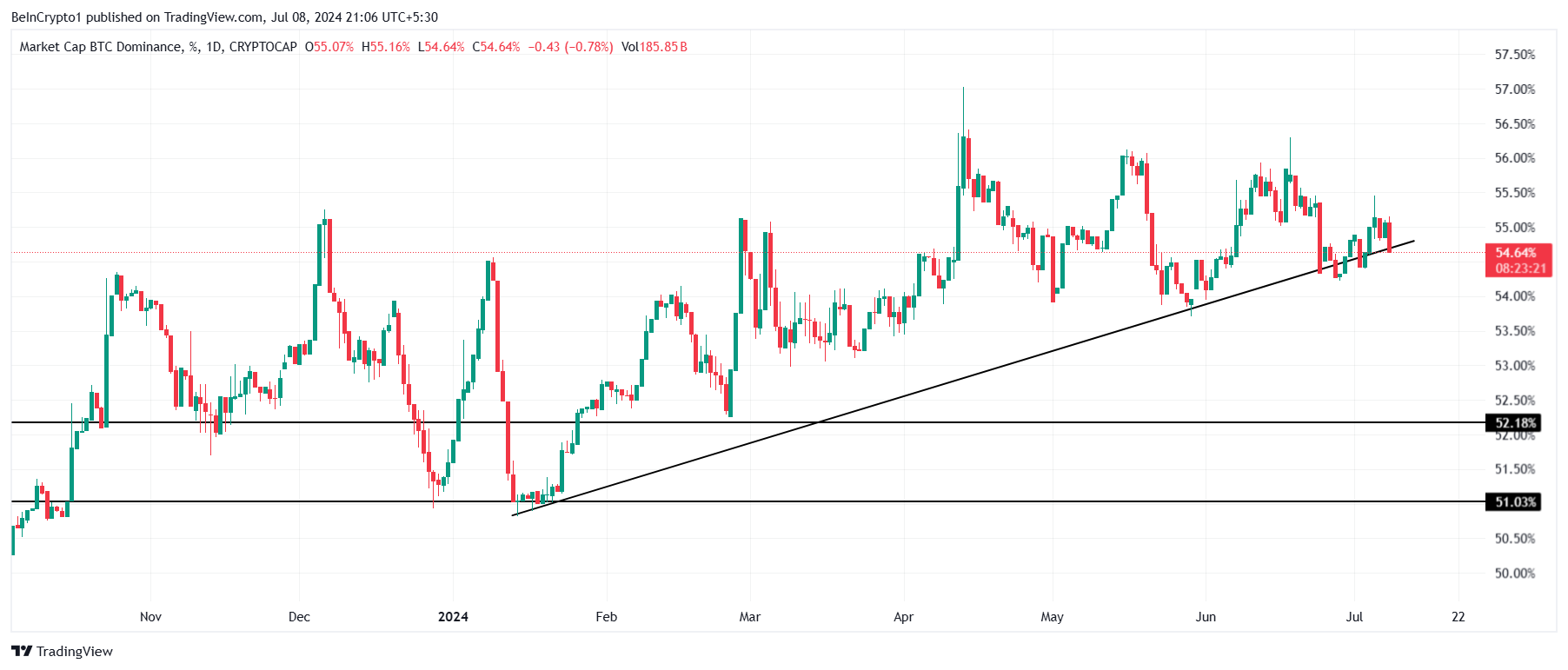 Tuttavia, il calo ha avuto un impatto sul dominio del mercato del BTC, anche se molto lieve. Al momento, il BTC rappresenta il 54,64% dell’intera capitalizzazione del mercato delle criptovalute. Nonostante il calo, il 54,64% è ancora ribassista per le altcoin.