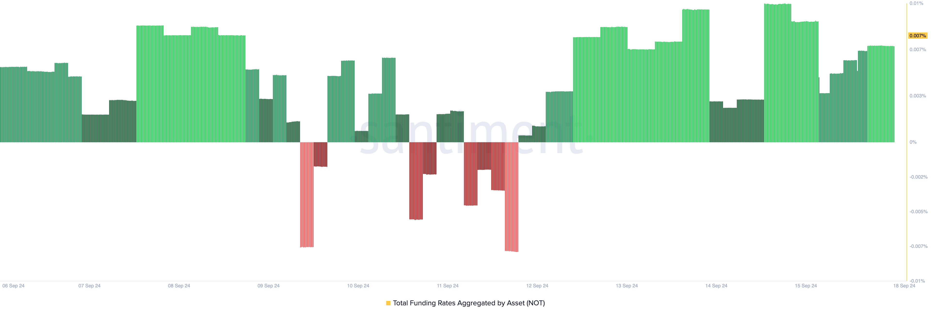 Il tasso di finanziamento positivo del token dal 12 settembre conferma questa prospettiva. Il tasso di finanziamento di NOT, usato nei suoi contratti futures perpetui per adeguare il prezzo del contratto al prezzo spot, è dello 0,007% al momento.