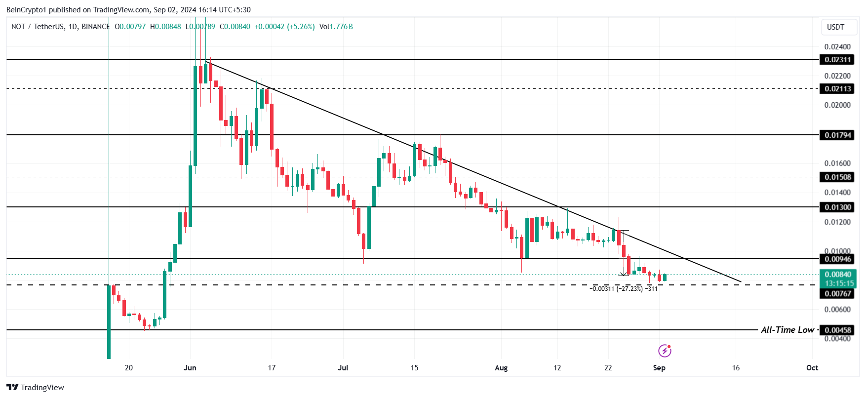 Il prezzo di Notcoin è stato bloccato sotto una linea di tendenza ribassista che è apparsa per la prima volta a giugno. Negli ultimi tre mesi, NOT ha tentato più volte di superare questa linea e avviare la ripresa.