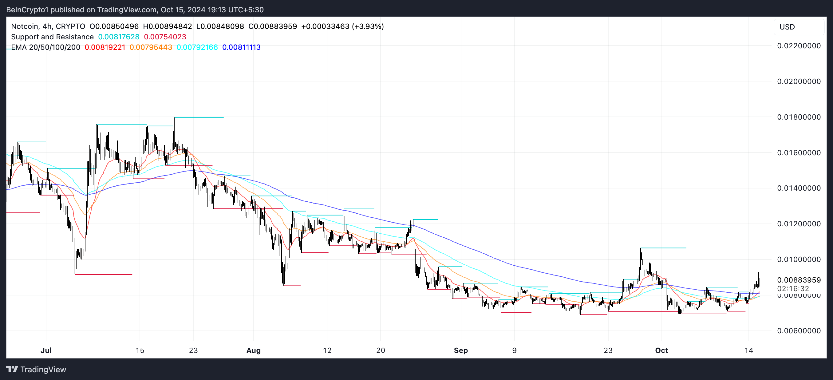 Con l’ADX di NOT attualmente forte e molti detentori ancora in perdita, le condizioni sono favorevoli per ulteriori movimenti ascendenti. Se la golden cross si forma e il trend continua, NOT potrebbe testare le resistenze a 0,0106 USD, con il potenziale di spingersi ancora più in alto a 0,0122 USD o addirittura a 0,01355 USD.