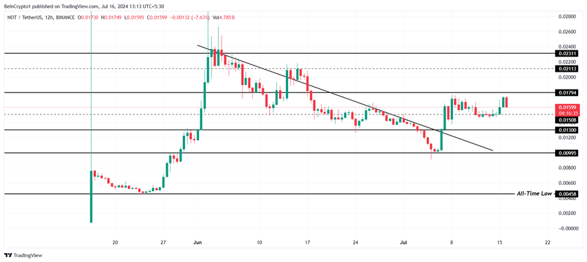 Ilprezzo di Notcoin, che scambia sotto la resistenza di 0,01794 dollari, è salito del 14% nelle ultime 24 ore. Questa barriera è stata testata più volte e la moneta di Telegram non è riuscita a superarla ogni volta nell’ultimo mese.