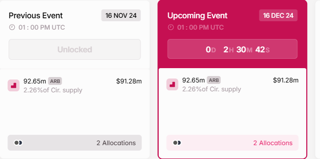 La rete Arbitrum è destinata a una certa volatilità questa settimana, con 92.65 milioni di token ARB in fase di sblocco lunedì alle 13:00 UTC. Questi token, valutati circa 91.15 milioni USD, costituiscono poco più del 2% dell’offerta circolante di ARB e saranno assegnati a investitori, al team e ai consulenti del progetto.
