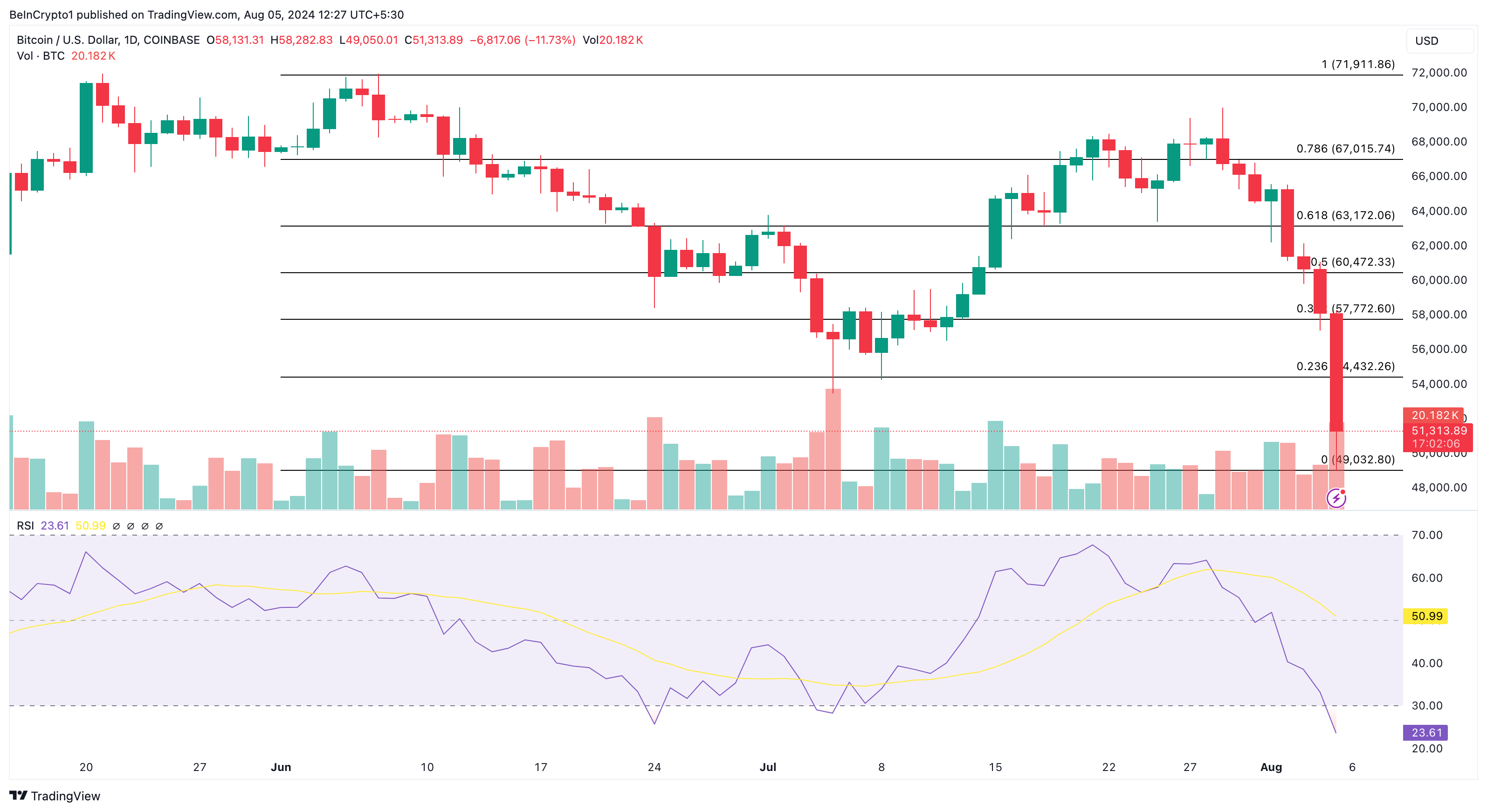 Nel frattempo, al momento della stampa, il BTC è tornato sopra i 50.000 dollari. In particolare, la moneta scambia a 51.313 dollari. Il rimbalzo potrebbe essere attribuito all’Indice di Forza Relativa (RSI) in territorio di ipervenduto.