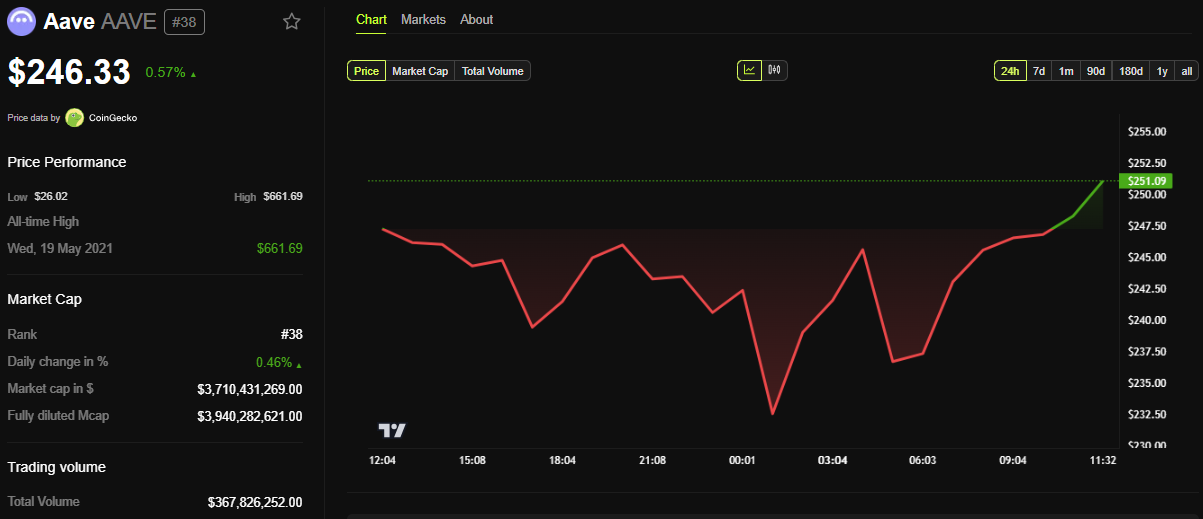 I dati di BeInCrypto mostrano che il prezzo di AAVE è aumentato di un modesto 0,57% dopo questa notizia. Al momento della scrittura, il token era scambiato a $246,33.