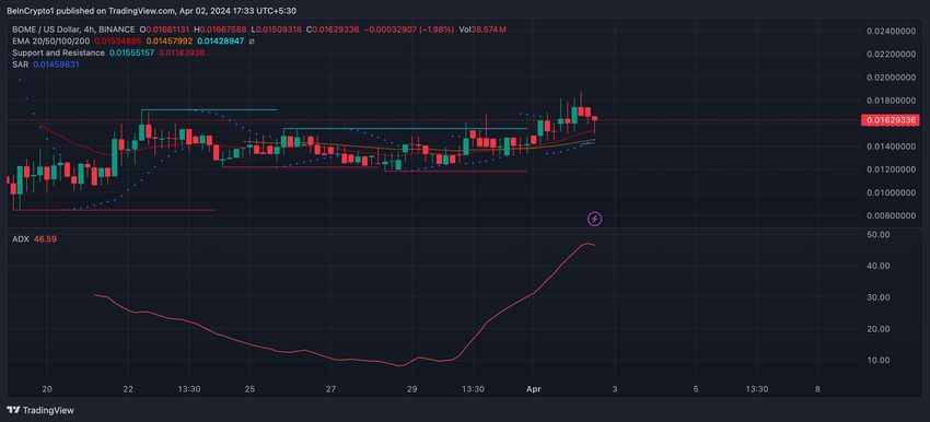 Le linee EMA, note come Medie Mobili Esponenziali, danno priorità ai dati di prezzo recenti, rendendole altamente reattive ai cambiamenti del mercato. Svolgono un ruolo fondamentale nel riconoscere le tendenze e le potenziali inversioni. Con una croce dorata formata dalle linee EMA e una forte tendenza indicata dall’Average Directional Index (ADX), è molto probabile che il prezzo di BOME subisca un’impennata nel prossimo futuro.
