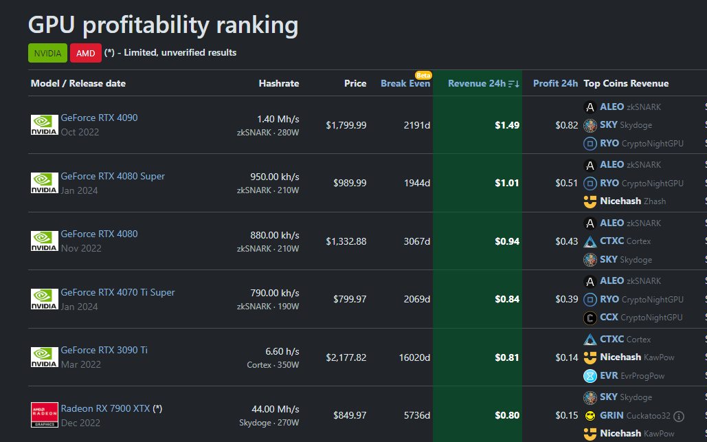 Inoltre, l’azienda ha continuato a dominare il mercato del GPU mining. Secondo gli ultimi dati, il suo hardware RTX ha superato consecutivamente qualsiasi altro prodotto sul mercato in termini di redditività del GPU mining.