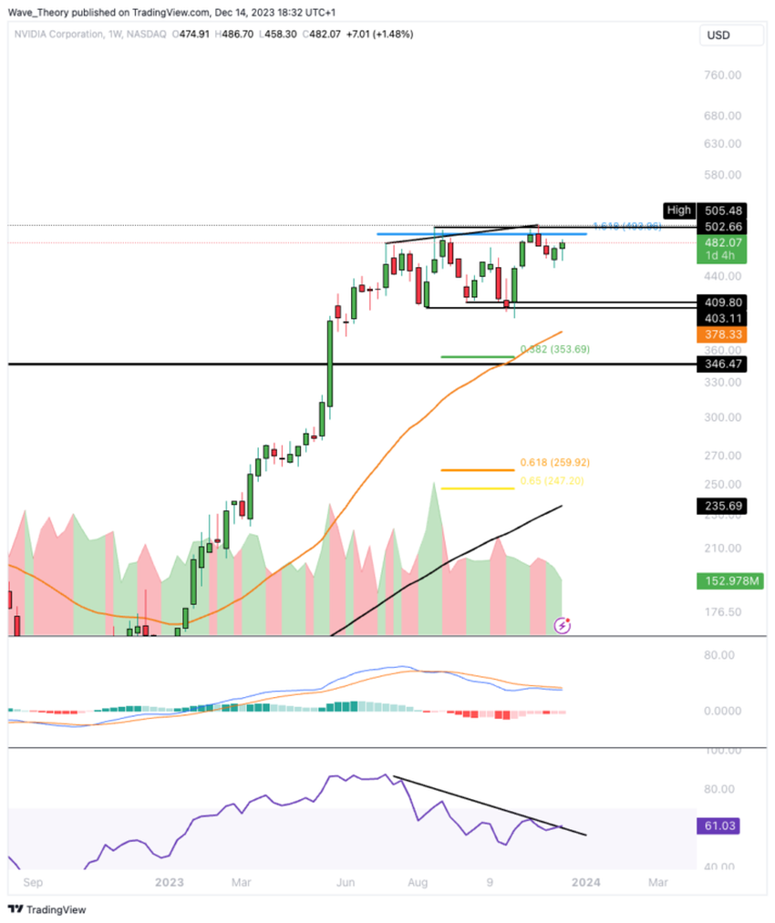 Il grafico settimanale di Nvidia mostra una divergenza ribassista nell’RSI
