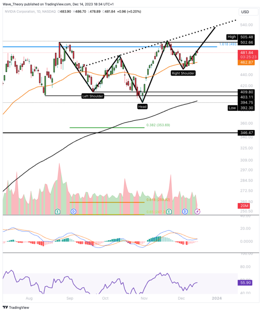 Uno sviluppo interessante nel grafico giornaliero è l’emergere di un modello di prezzo rialzista. Nello specifico, si tratta di un modello di “testa e spalle inverso”. Questo modello è tipicamente visto come un indicatore di inversione rialzista. Se il prezzo delle azioni di Nvidia sale sopra i 540 dollari, potrebbe confermare un breakout rialzista da questo modello. Ciò potrebbe potenzialmente portare a un ulteriore movimento al rialzo dei prezzi.