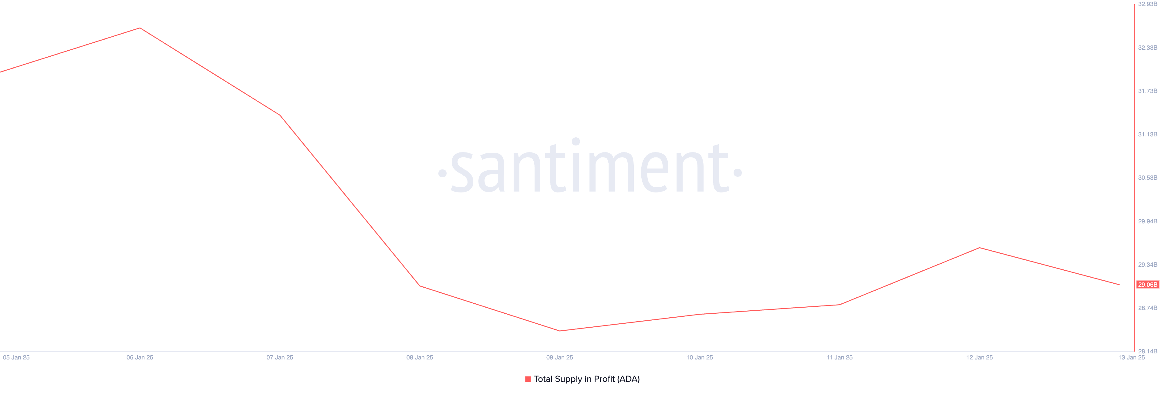Il prezzo di Cardano è sceso del 13% nell’ultima settimana, riducendo il numero di monete ADA detenute in profitto. I dati on-chain rivelano che la fornitura totale di Cardano in profitto è diminuita di 3,55 miliardi di ADA in sette giorni.