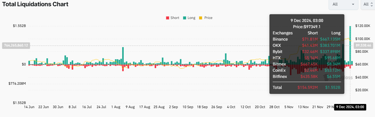 Secondo i dati di Coinglass, 583.530 trader sono stati spazzati via nelle ultime 24 ore. Le liquidazioni totali hanno superato 1.7 miliardi USD in seguito. Di questi, almeno 1.552 miliardi USD erano posizioni long, mentre 154.59 milioni USD erano short.