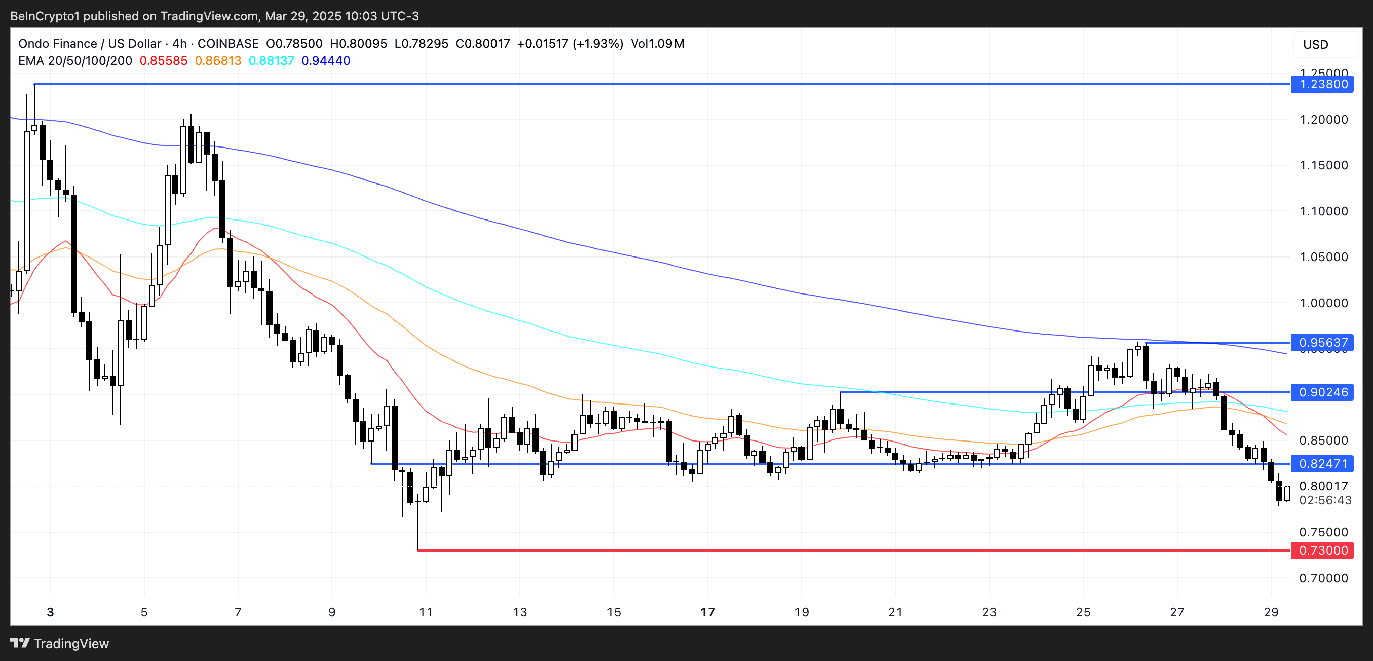Le linee della Media Mobile Esponenziale (EMA) di ONDO sono attualmente allineate in una formazione ribassista, suggerendo che il trend al ribasso in corso potrebbe persistere. Se questa debolezza continua, ONDO potrebbe scendere a testare il livello di supporto chiave a $0,73.
