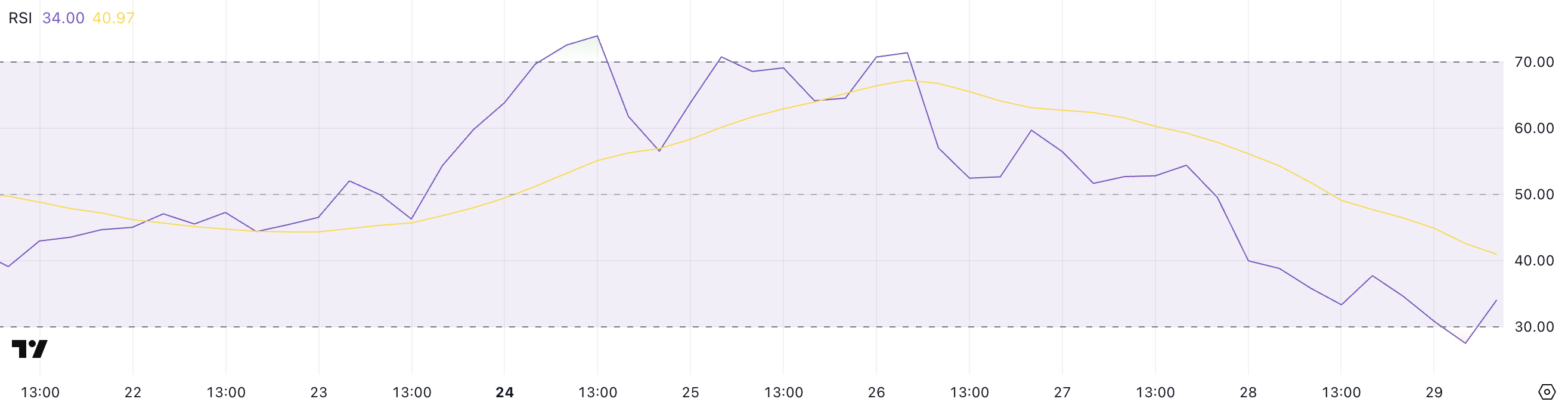 L’Indice di Forza Relativa (RSI) di ONDO è attualmente a 34 dopo un lieve rimbalzo da un precedente calo a 27,5. Solo due giorni fa, l’RSI era a 54,39, indicando quanto rapidamente il momentum sia cambiato.