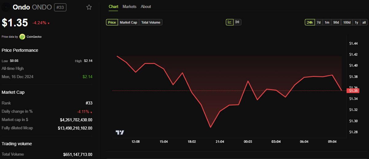 Infatti, il token di Ondo Finance continua a essere scambiato con un trend ribassista. Secondo i dati di BeInCrypto dati, il prezzo di ONDO è sceso di quasi 5%, scambiando a $1,35 al momento della scrittura.