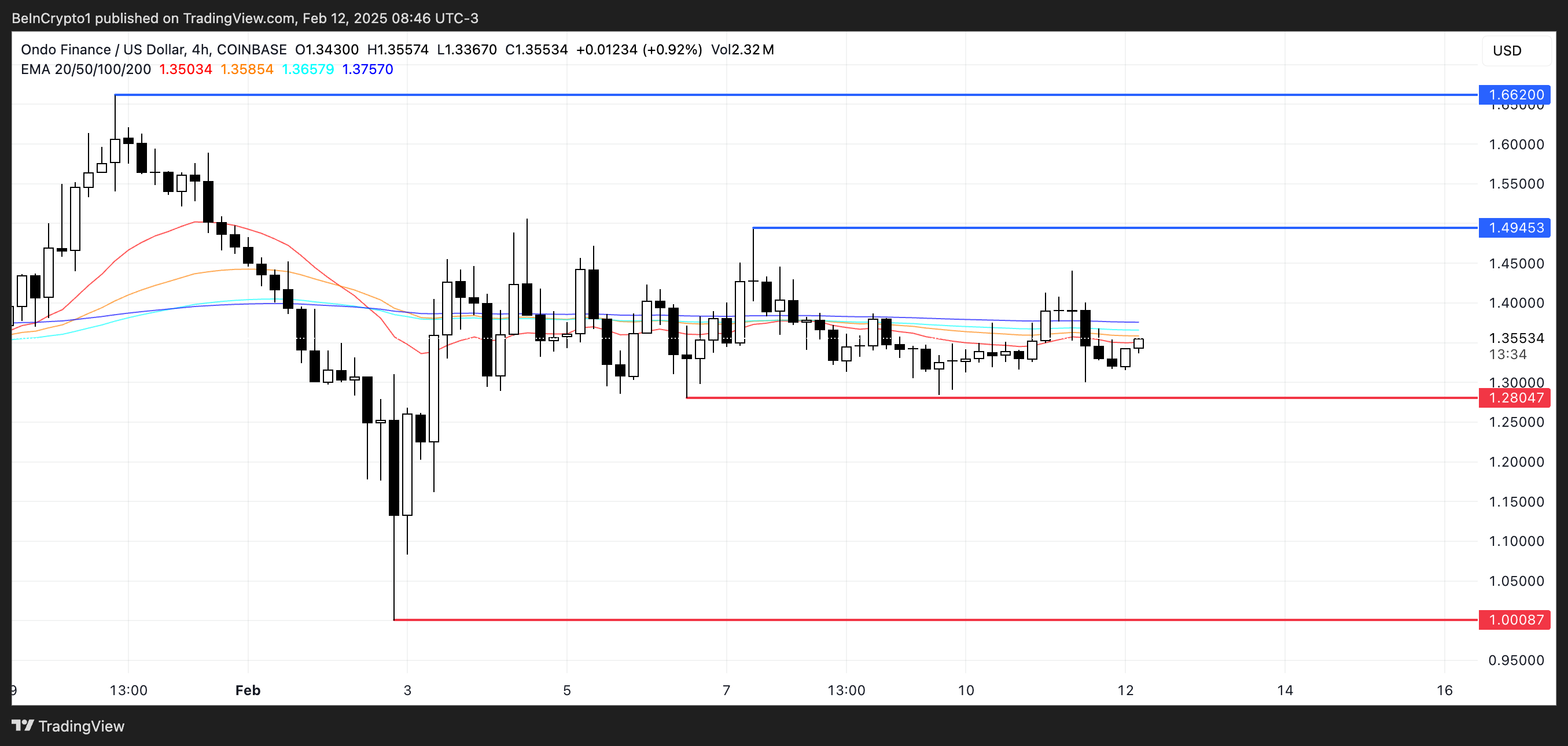 Il prezzo di ONDO è stato scambiato in un range ristretto tra $1,38 e $1,31 negli ultimi giorni, anche dopo che ha annunciato il suo Layer-1. Le sue linee EMA sono strettamente allineate, segnalando una mancanza di chiaro slancio.