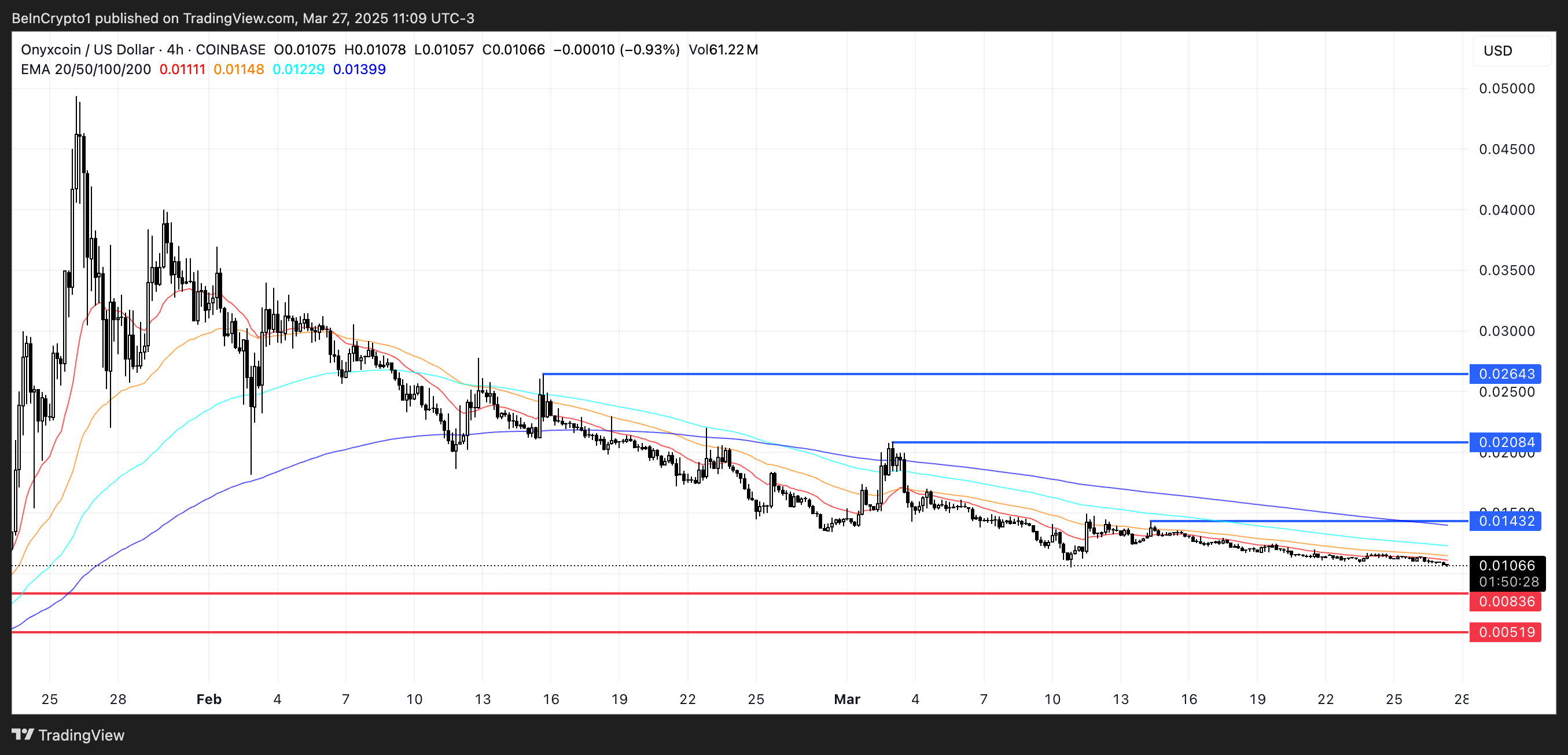 Le linee EMA di Onyxcoin sono attualmente allineate in una formazione ribassista, suggerendo che il trend ribassista potrebbe persistere nel breve termine.