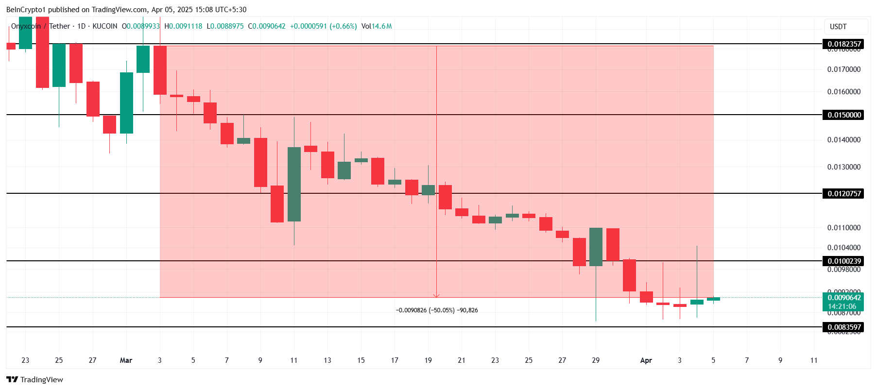 Il prezzo di Onyxcoin è attualmente a $0,0090, avendo subito un significativo calo del 50% nell’ultimo mese. Se il momentum ribassista persiste, XCN potrebbe scendere al livello di supporto di $0,0083, estendendo ulteriormente le sue perdite.