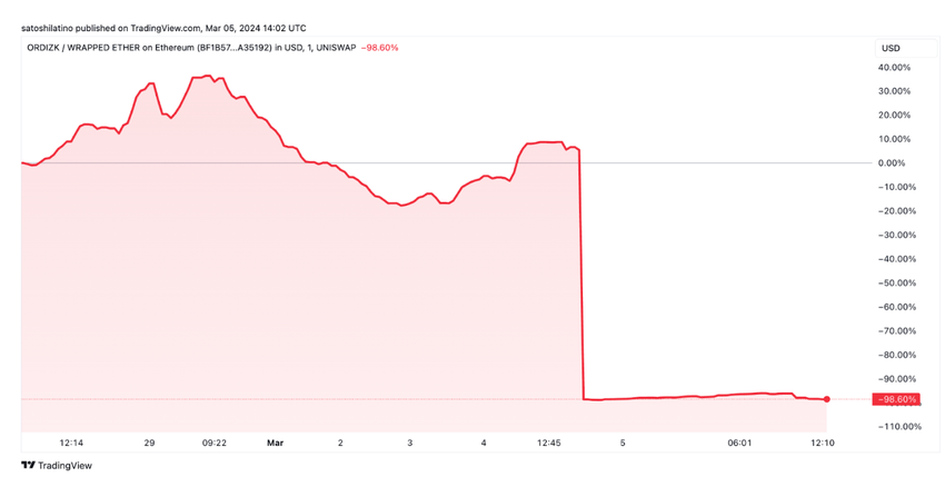 “Abbiamo assistito a una truffa su OrdiZK. Il sito web e gli account dei social media sono stati cancellati. Il deployer detiene circa 1 milione di dollari di ETH derivanti dal dumping dei token, dalla rimozione di ETH dai contratti di progetto e dalle tasse sulle vendite”, ha dichiarato la società di sicurezza blockchain Certik.