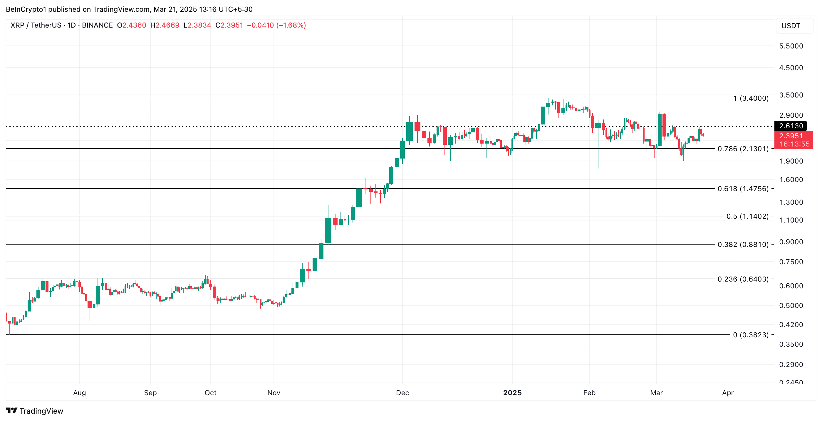 XRP viene scambiato a $2,39, sopra il livello di supporto a $2,13. Se il sentimento ribassista persiste, il token potrebbe subire un calo verso questo minimo. Se i rialzisti non riuscissero a difendere questo supporto, il prezzo di XRP potrebbe scendere ulteriormente a $1,47.