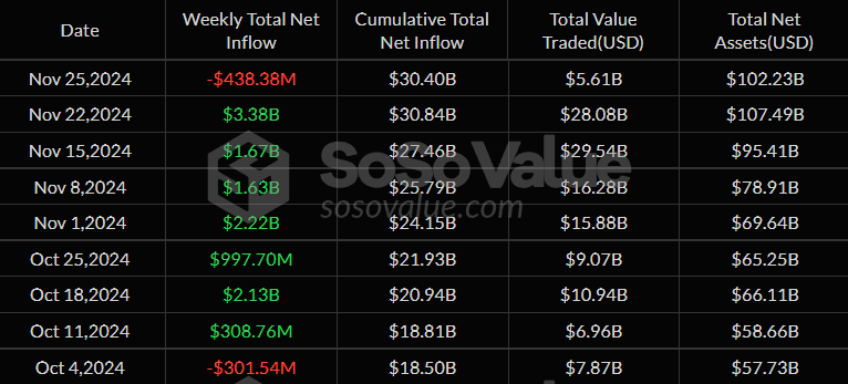 Allo stesso tempo, i Bitcoin ETF hanno registrato una domanda fluttuante. Il 25 novembre, gli ETF hanno registrato un deflusso netto di 438,38 milioni USD dopo cinque giorni consecutivi di afflussi che hanno totalizzato 3,5 miliardi USD.