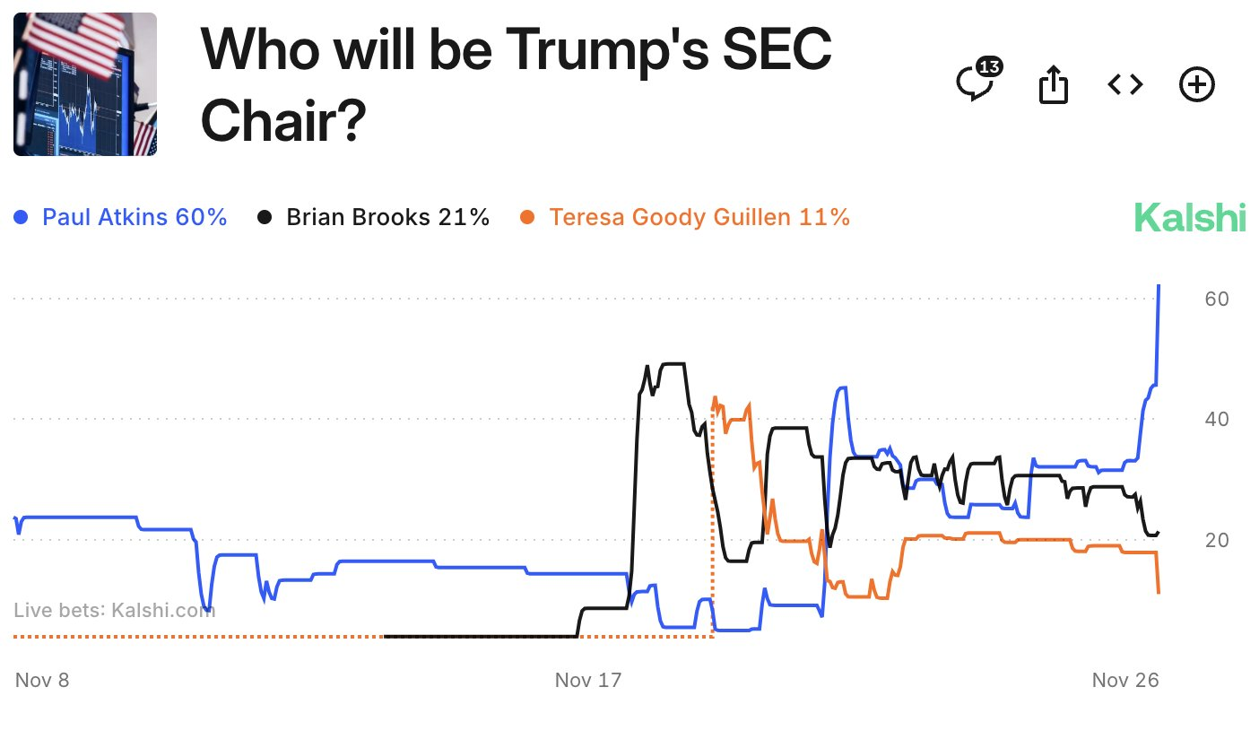 Il presidente eletto Donald Trump ha intervistato Paul Atkins per la posizione di presidente della SEC. Diversi rapporti hanno affermato che Atkins è l’attuale favorito per il ruolo, aumentando le sue probabilità nei mercati delle previsioni.