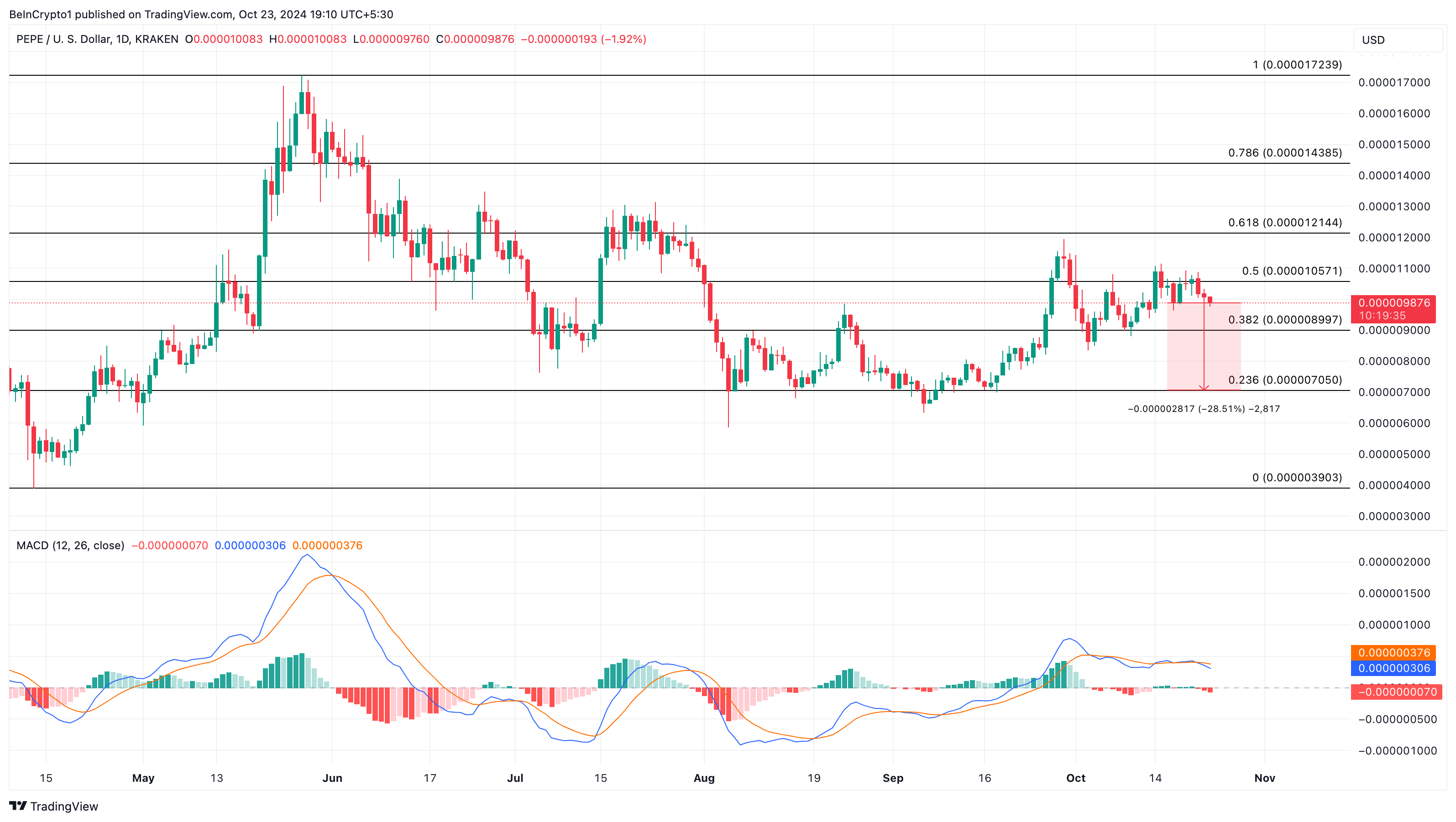 Uno sguardo al grafico giornaliero PEPE/USD mostra che il Moving Average Convergence Divergence (MACD) è sceso in regione negativa.