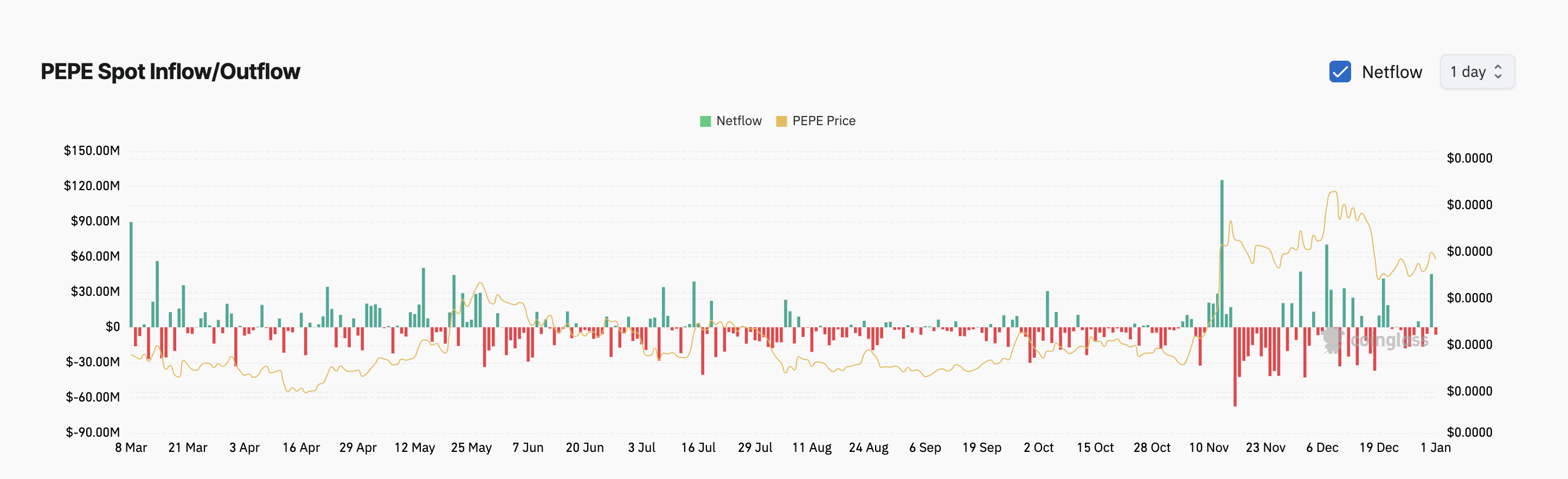 Inoltre, l’aumento degli outflow spot di PEPE rafforza ulteriormente questa prospettiva ribassista. Secondo Coinglass, nelle ultime 24 ore, sono stati ritirati 6.34 milioni USD dal mercato spot. Questo è in netto contrasto con i 45 milioni USD di inflow di PEPE registrati martedì.