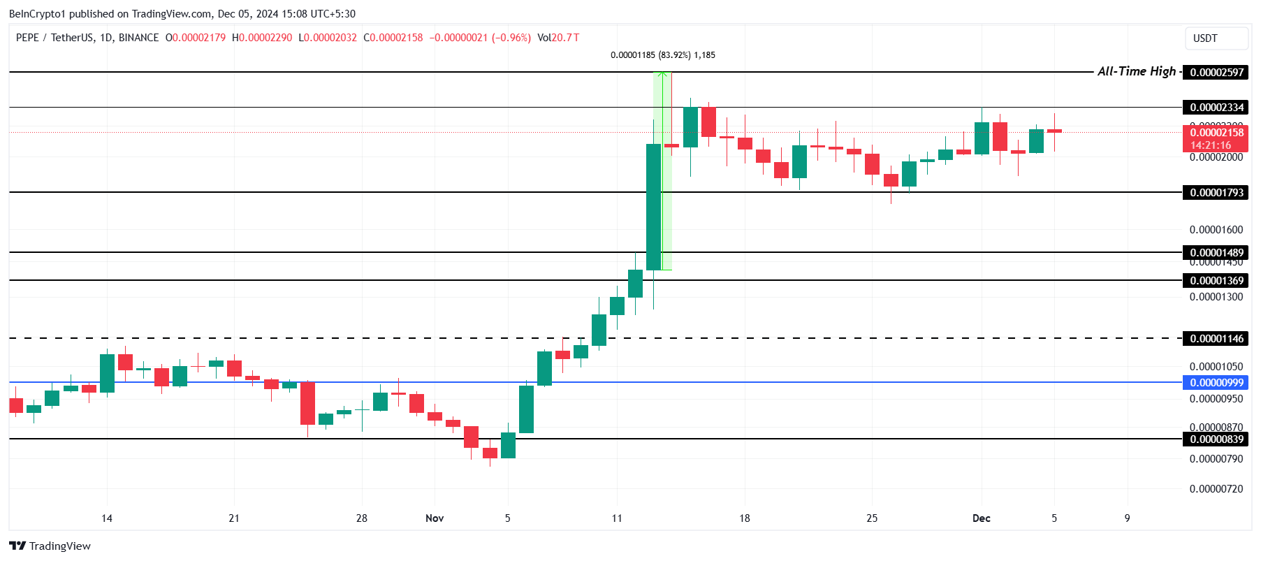 Tuttavia, un importante sviluppo all’orizzonte potrebbe iniettare nuova vita nel mercato e stimolare la crescita. Il 5 dicembre, PEPE verrà quotato su Binance.US. Questa mossa dovrebbe aumentare la liquidità e attrarre nuovi investitori, potenzialmente catalizzando una nuova tendenza al rialzo per PEPE.