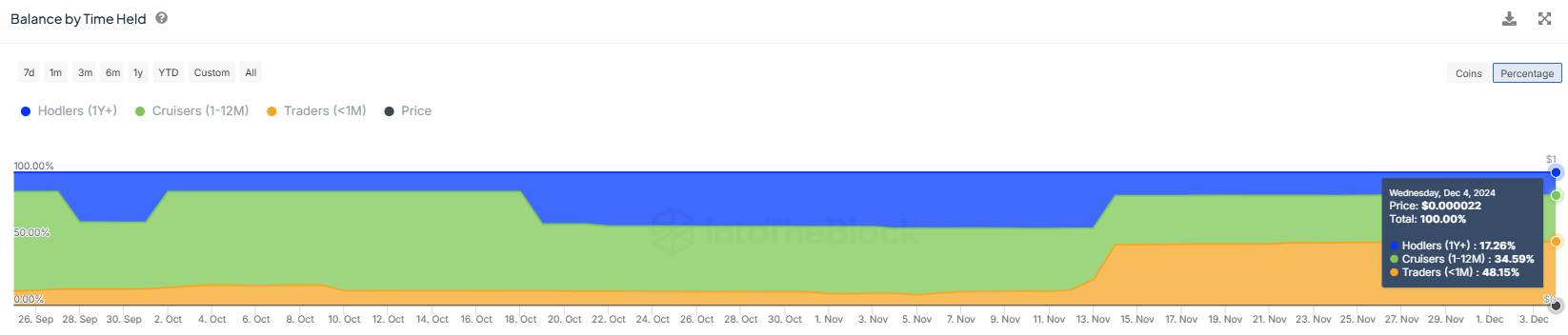 Attualmente, i detentori a breve termine stanno dominando l’offerta di PEPE. Questi detentori, che tipicamente mantengono gli asset per meno di un mese, rappresentano più del 48% dell’offerta totale. Sebbene questo indichi un mercato volatile, significa anche che la maggior parte dei detentori di PEPE potrebbe essere più incline a vendere rapidamente le proprie posizioni.