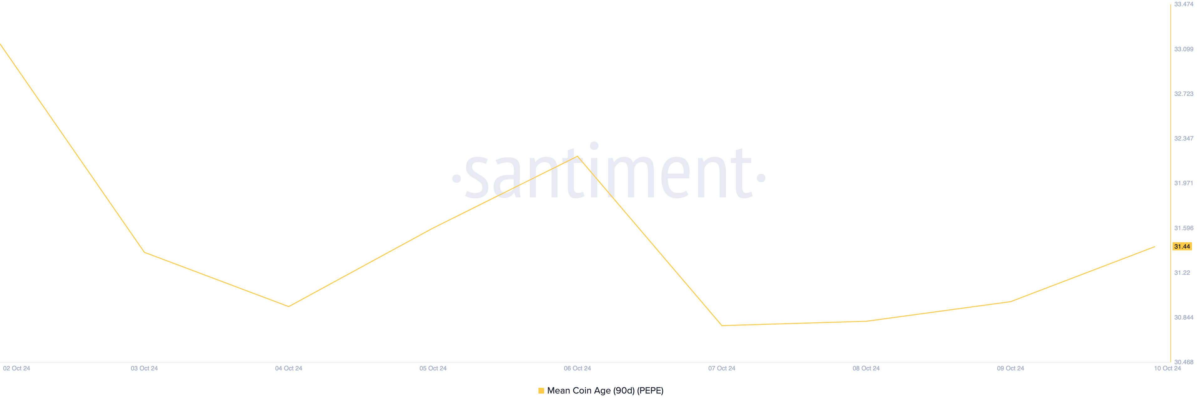 Inoltre, l’età media della moneta PEPE è in aumento e attualmente si trova a 31,44, con un aumento del 2% negli ultimi due giorni. Questa metrica traccia l’età media delle monete in circolazione, misurando quanto a lungo sono state tenute senza essere spostate o spese.